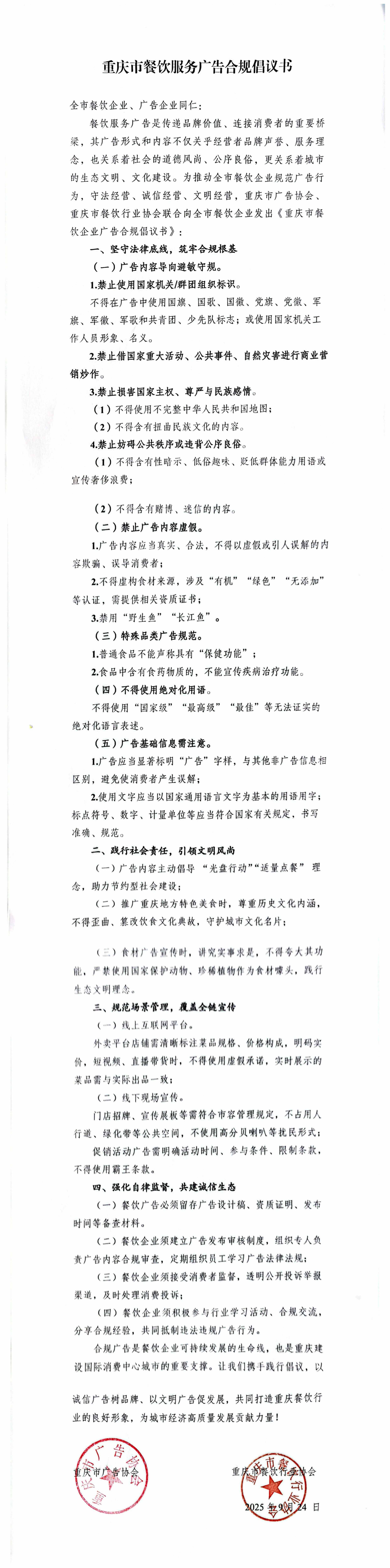 重庆市餐饮服务广告合规倡议书