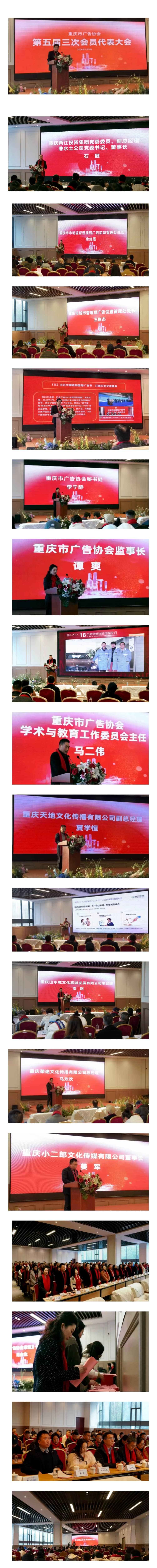 冬日暖阳,万象更新。1月9日下午,重庆市广告协会第五届三次会员代表大会暨新年团拜会在重庆两江影视城隆重举行。协会会员代表、行业专家、企业嘉宾、业务主管部门领导140余人齐聚一堂,总结过往成效,共话发展新篇。重庆两江投资集团党委委员、副总经理兼水土公司党委书记、董事长石键到会致欢迎辞;市市场监督管理局广告监督管理处处长佘红霞、市城市管理局广告设置管理处处长王彬杰等业务主管部门领导到会作了重要讲话。会议由协会党支部书记、会长肖金生主持。 一、审议协会2025年工作总结和2026年工作计划 协会秘书长罗素明作《团结奋进、善作善成、推动广告行业健康发展》的2025工作总结暨2026年工作计划的报告;协会秘书处李宁静作了2025年财务工作报告;协会监事长谭爽作了2025年监事会工作报告,经全体会员代表审议,一致通过以上各项工作报告。 二、审议《重庆市广告协会章程》修改报告 依据重庆市民政局关于印发《重庆市协会商会章程示范文本》的通知(渝民发[2024] 5号)和关于《开展全市性社会团体党建工作入章程自查工作》的通知要求,协会组织工作人员,对原(旧)章程进行了修改。肖金生作了《重庆市广告协会章程》修改报告,修改前的章程为九章七十条,修改后的新章程为十章九十一条。(具体内容略)。 到会会员代表采用无记名投票方式,对章程修改进行了投票表决,一致同意协会章程修改报告。接下来协会将依序完成关于章程修改的各项报批审核工作。 三、大会代表发言 围绕广告产业高质量发展的工作任务,结合十五五开局之年重庆广告产业发展的新要求,重庆广告人决心不断创新、迎接挑战,努力为新重庆建设做出新的贡献。重庆年度视野文化有限公司总经理曾奇;重庆市广告协会学术与教育工作委员会主任马二伟;重庆天地文化传播有限公司副总经理夏学恒;重庆翰宗数码传媒有限公司策划创意部经理殷静;重庆山水城文化旅游发展有限公司总经理贾刚;重庆荣途文化传播有限公司总经理马欢欢;重庆小二郎文化传媒有限公司董事长姜军等会员单位代表,在大会上作了热情洋溢的发言。 高朋满座辞旧岁,欢声笑语话新年,抱团取暖齐努力,扬帆起航再出发。在团拜会热情恳谈,相互祝愿,携手共进,恭祝新年的友好氛围中,第五届三次会员代表大会暨新年团拜会圆满结束。